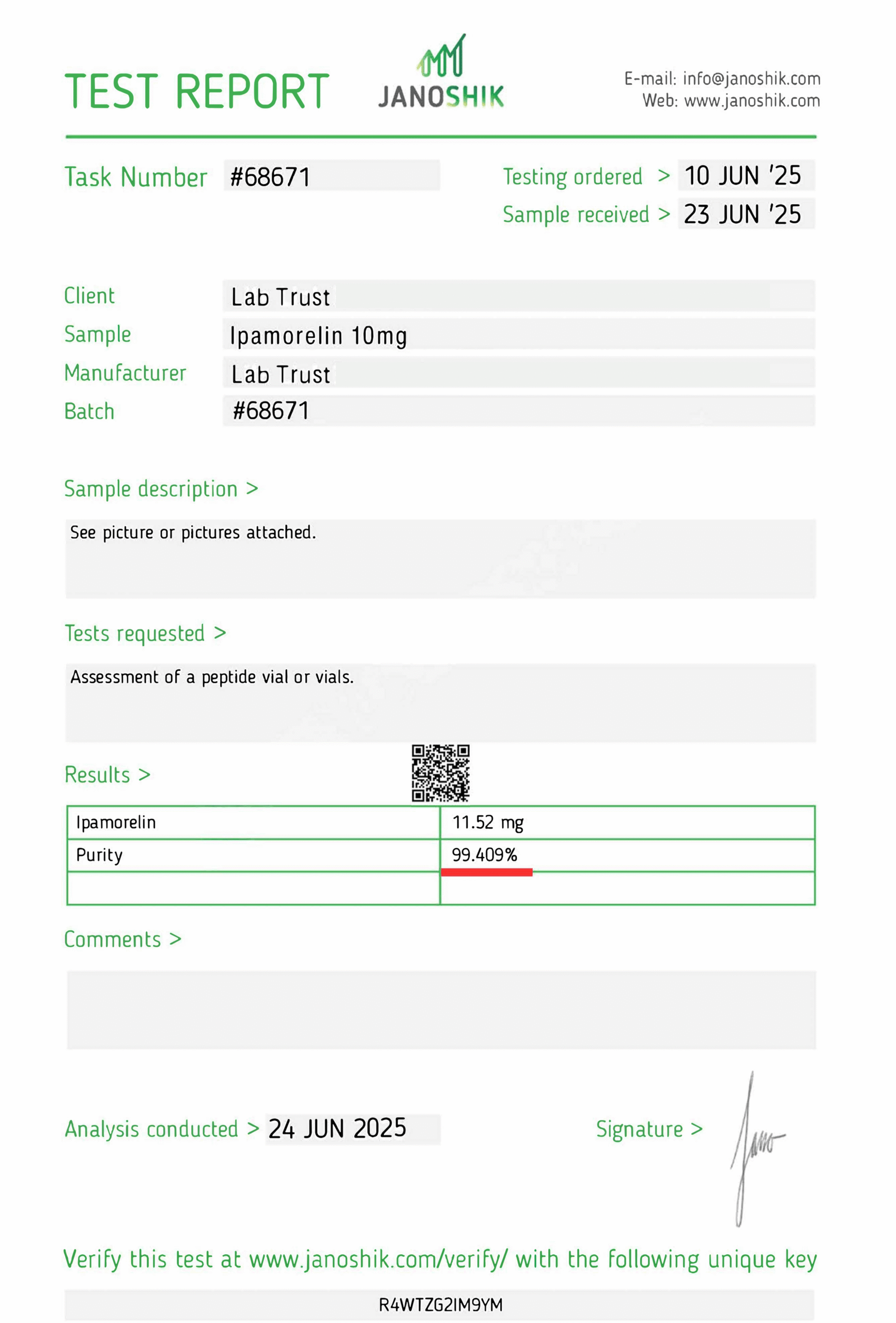 At Lab Trust Peptides, quality is verified through independent third-party analytical testing conducted on each production batch. Every peptide is supplied with complete Certificates of Analysis (COAs) confirming identity, purity, and batch consistency.